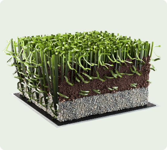 Superficie compuesta por cuatro secciones de fibra diseñadas para resiliencia, cobertura, confort y rendimiento térmico. Destaca por resistencia y certificaciones internacionales.