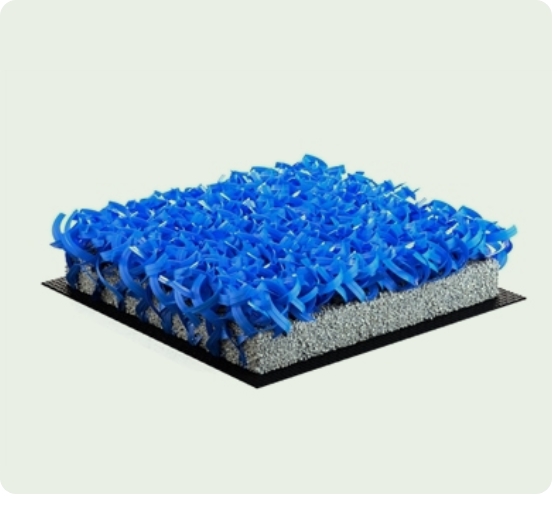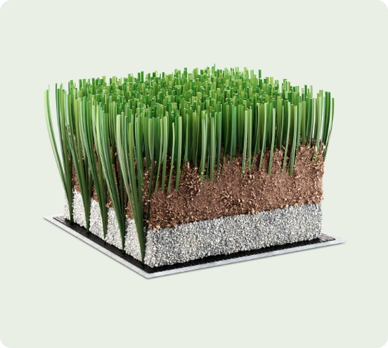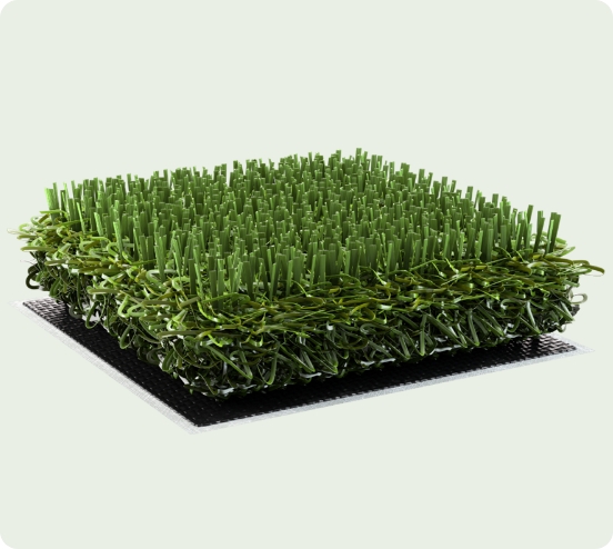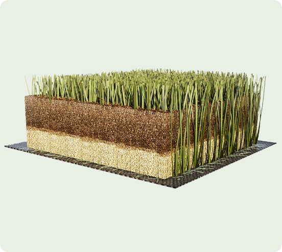 Superficie compuesta por cuatro secciones de fibra diseñadas para resiliencia, cobertura, confort y rendimiento térmico. Destaca por resistencia y certificaciones internacionales.